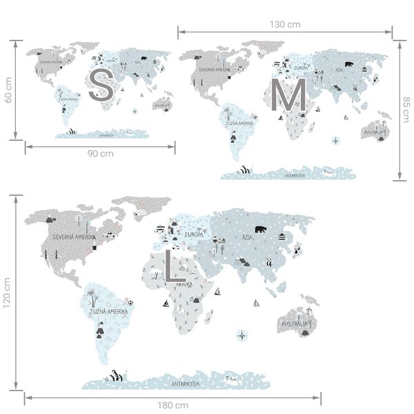 Всеки елемент от картата е внимателно изрязан от контура и залепен поотделно, което улеснява приложението, особено в случай на големи пространства. Размерът на стикера се измерва след поставянето му на стената, а континентите са на съответното разстояние един от друг.