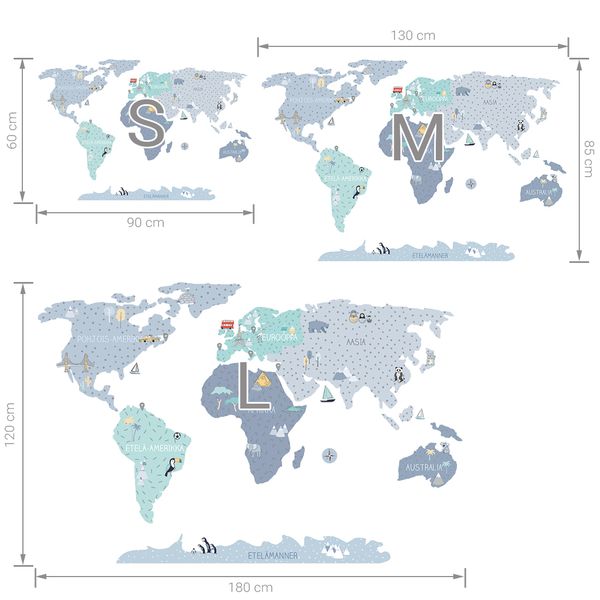 Всеки елемент от картата е внимателно изрязан от контура и залепен поотделно, което улеснява приложението, особено в случай на големи пространства. Размерът на стикера се измерва след поставянето му на стената, а континентите са на съответното разстояние един от друг.