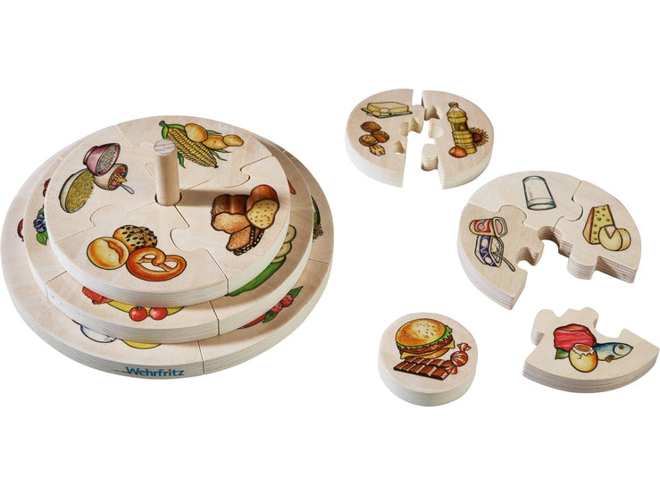 Триизмерен дървен пъзел, специално разработен и е подходящ и за деца, като ги учи на балансираното хранене, което е добро не само да тялото, но и за душата. Образователната игра запознава децата с хранителната пирамида. Големите дървени части на пъзела са с интересен 3D ефект и са лесни за хващане.