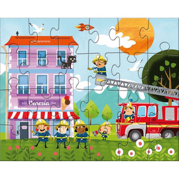 Образователна играчка, в кутията може да откриете ТРИ красиви пъзела за деца с различни атрактивни сцени, всяка една с 24 елемента. Децата се запознават с дейността на пожарникарите и разказват това, което предизвиква въображението им, гледайки картинките и др. Този пъзел е част от "Система за ранно развитие и взаимодействие Хаба". Тази система е много полезна за развитието на децата през първите седем години и има висока образователна стойност.