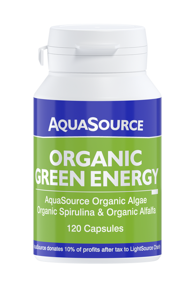 AquaSource Органична Зелена енергия комбинира три натурални съставки: суперхраната AquaSource органични водорасли, органична спирулина и сок от органична люцерна на прах, предназначени да спомагат за поддържане на оптимални енергийни нива, на имунната система и на нормалните когнитивни функции.